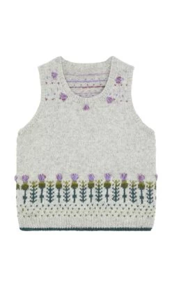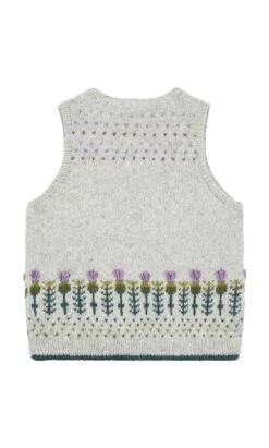 Hand-knitted grey marl vest embellished with folksy knitted and embroidered thistles around the bottom and yoke. Handknitted in Nepal from pure natural wools. Fairtrade production. Please note that due to the artisanal nature of this product, some details in the embroidery differ a little from the image shown, making each garment unique.