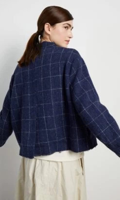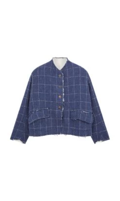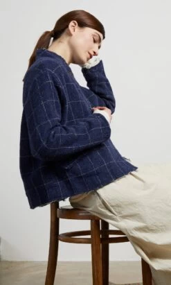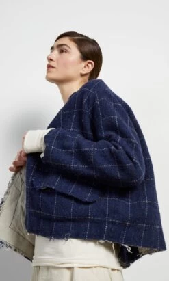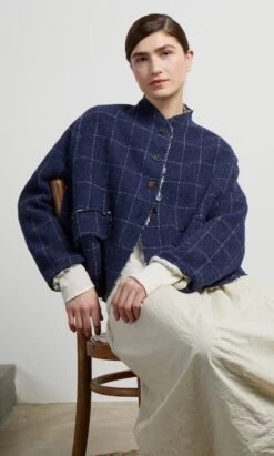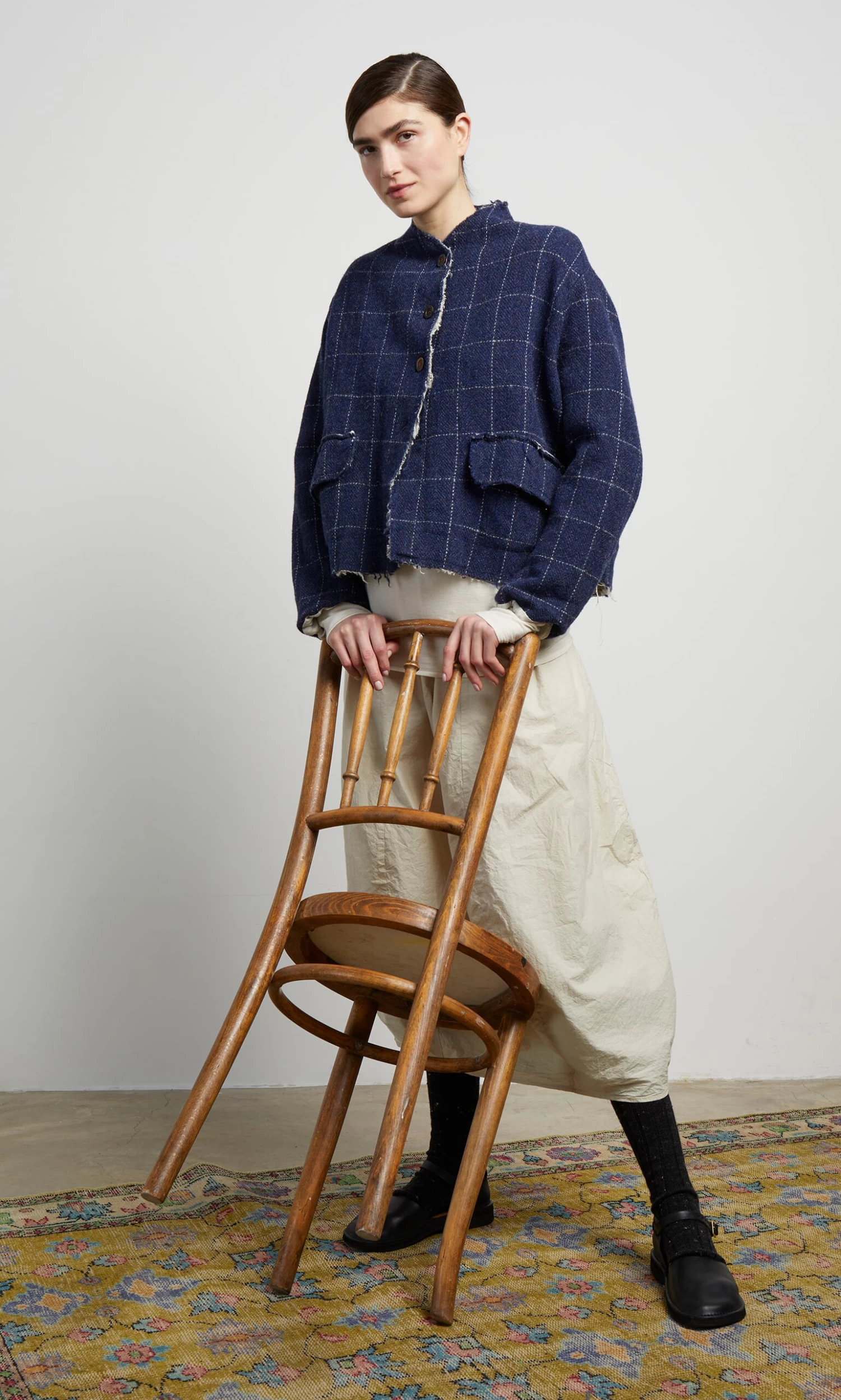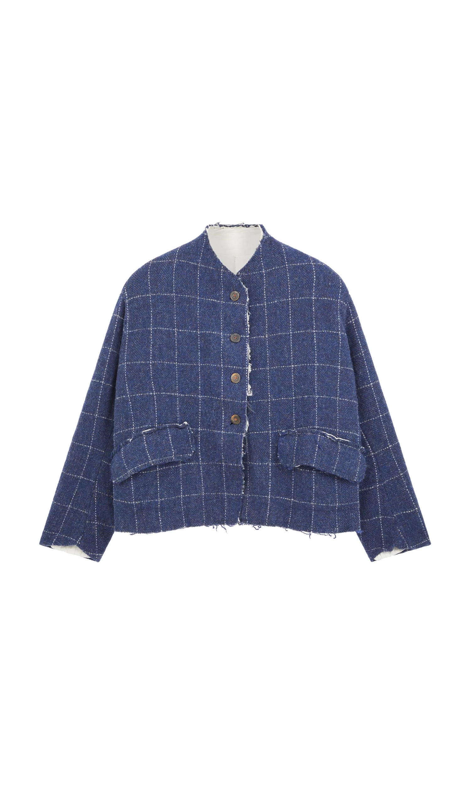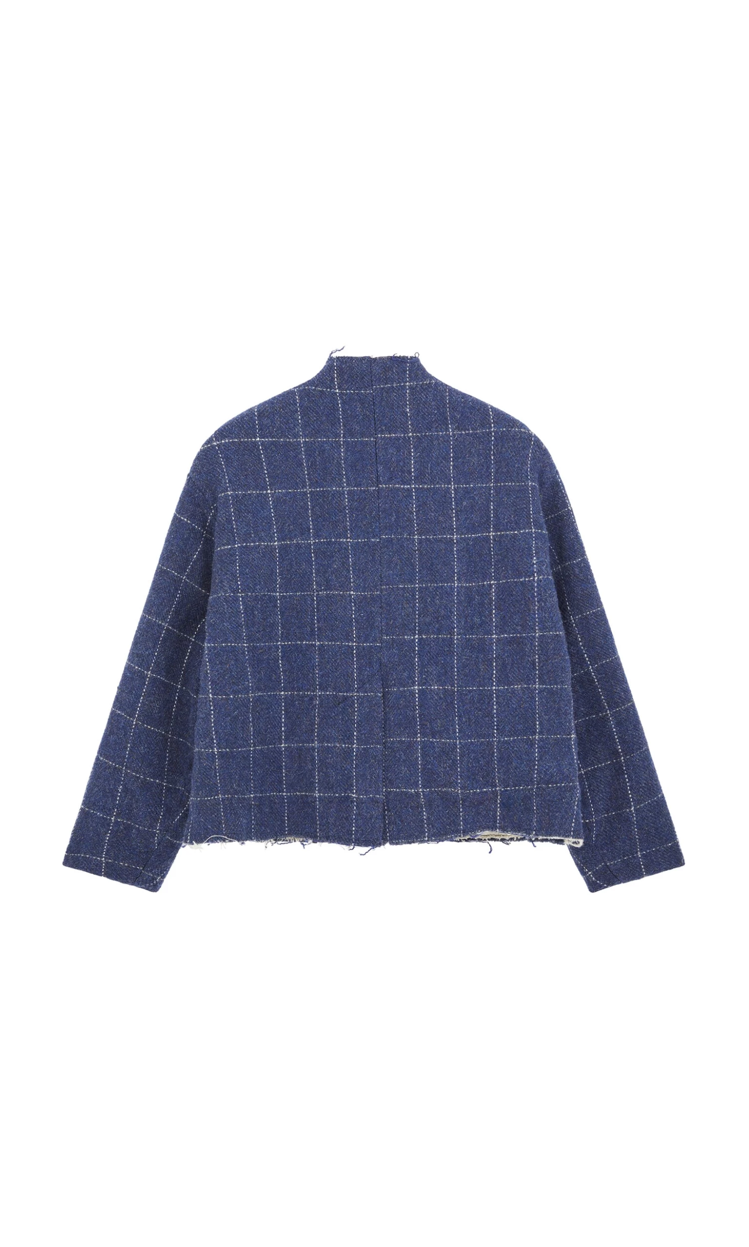 Shortish check jacket in an indigo wool melange. Its classic origins have been given an artisanal twist with raw, unfinished edges and stitched-on pocket flaps. Horn buttons fasten through the front and are fixed in place with vibrant red thread. Overall fit is relaxed with a single back vent for easy movement. Hand dyed to give a unique finish. Fully lined. Hannoh Wessel.