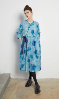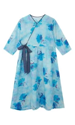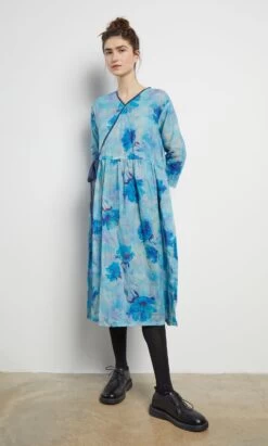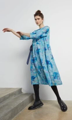 Papertouch dress in a painterly floral print with asymmetric ribbon tie embellishment. Relaxed shape with skirt gently gathered onto a marked waist. Straight, cropped sleeves. L118cm