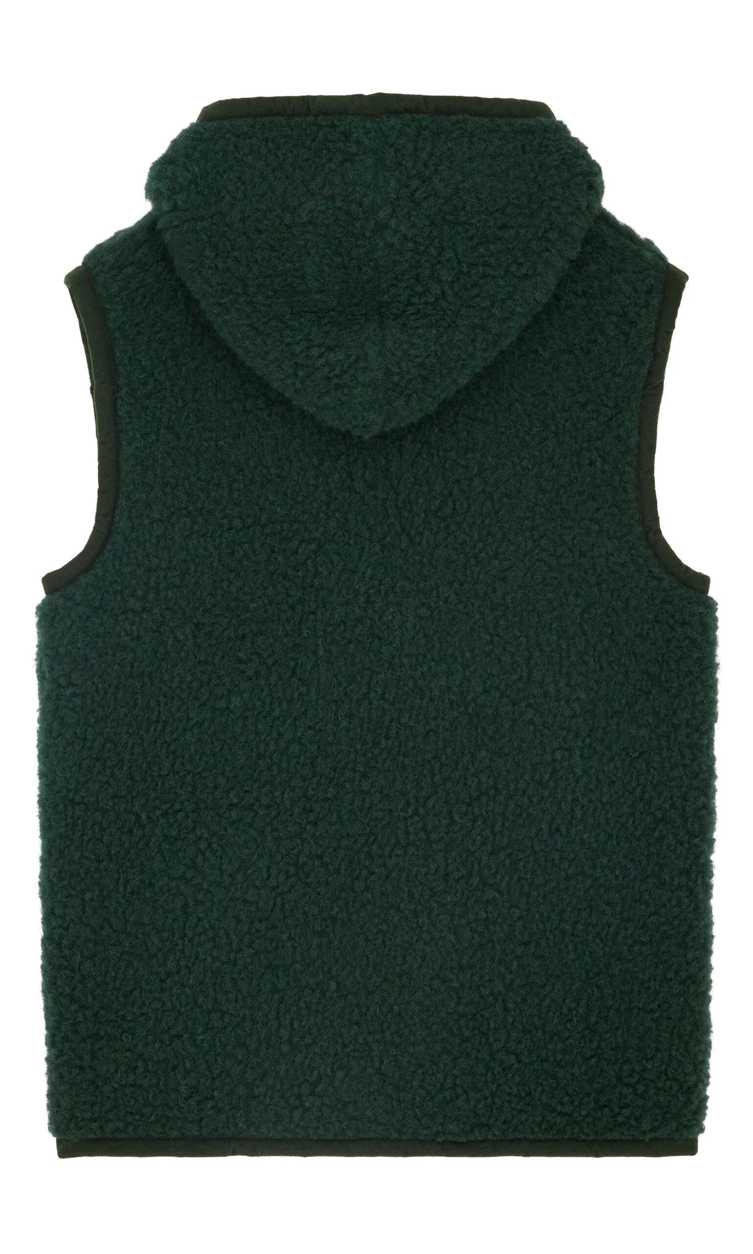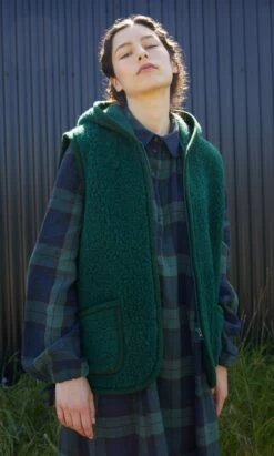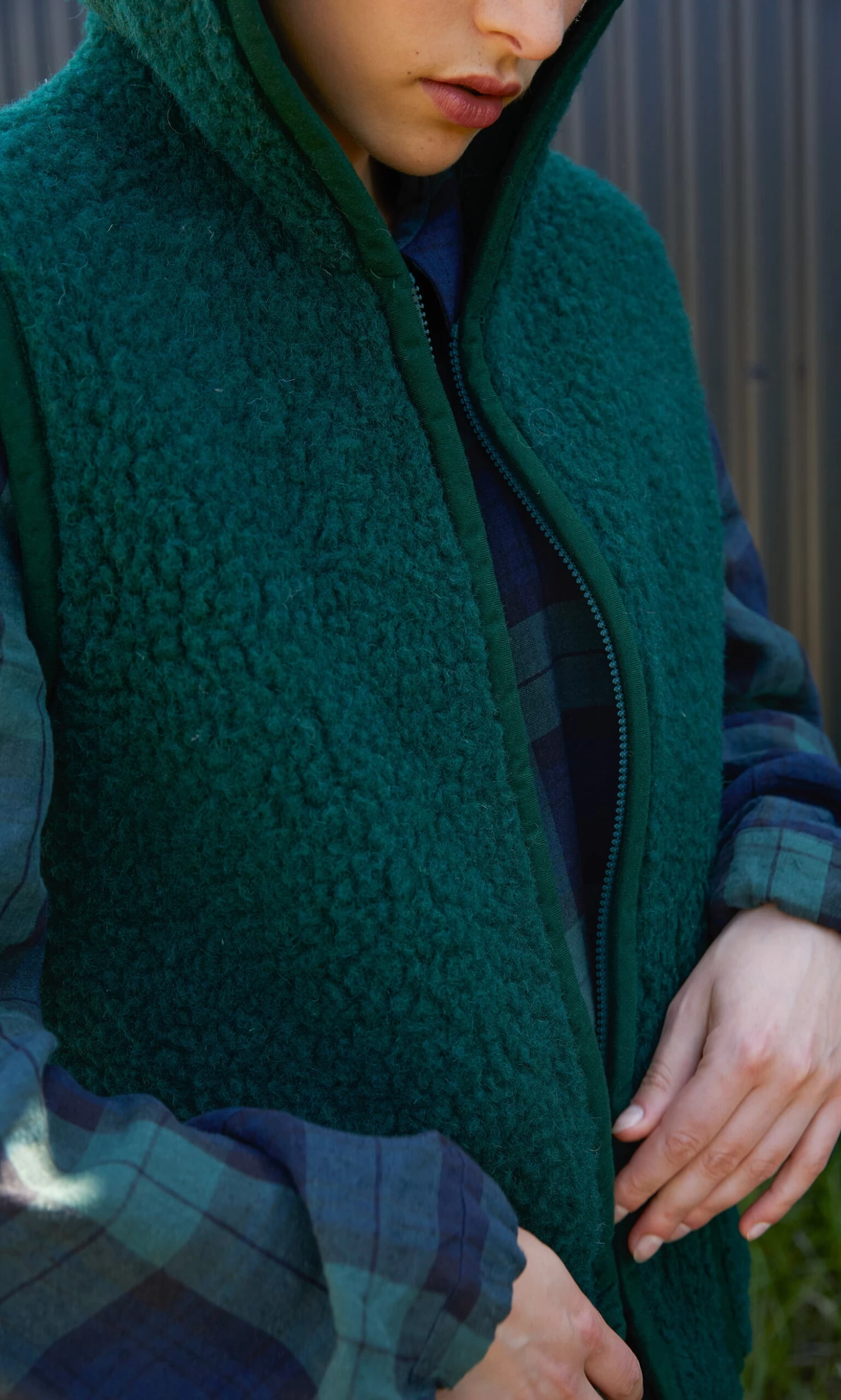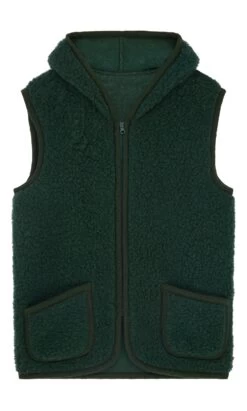 Super snug and lightweight dark green gilet made from tactile Irish wool fleece with integrated hood. Easy additional layer to keep the chills at bay. Zip front. Cosy patch pockets.