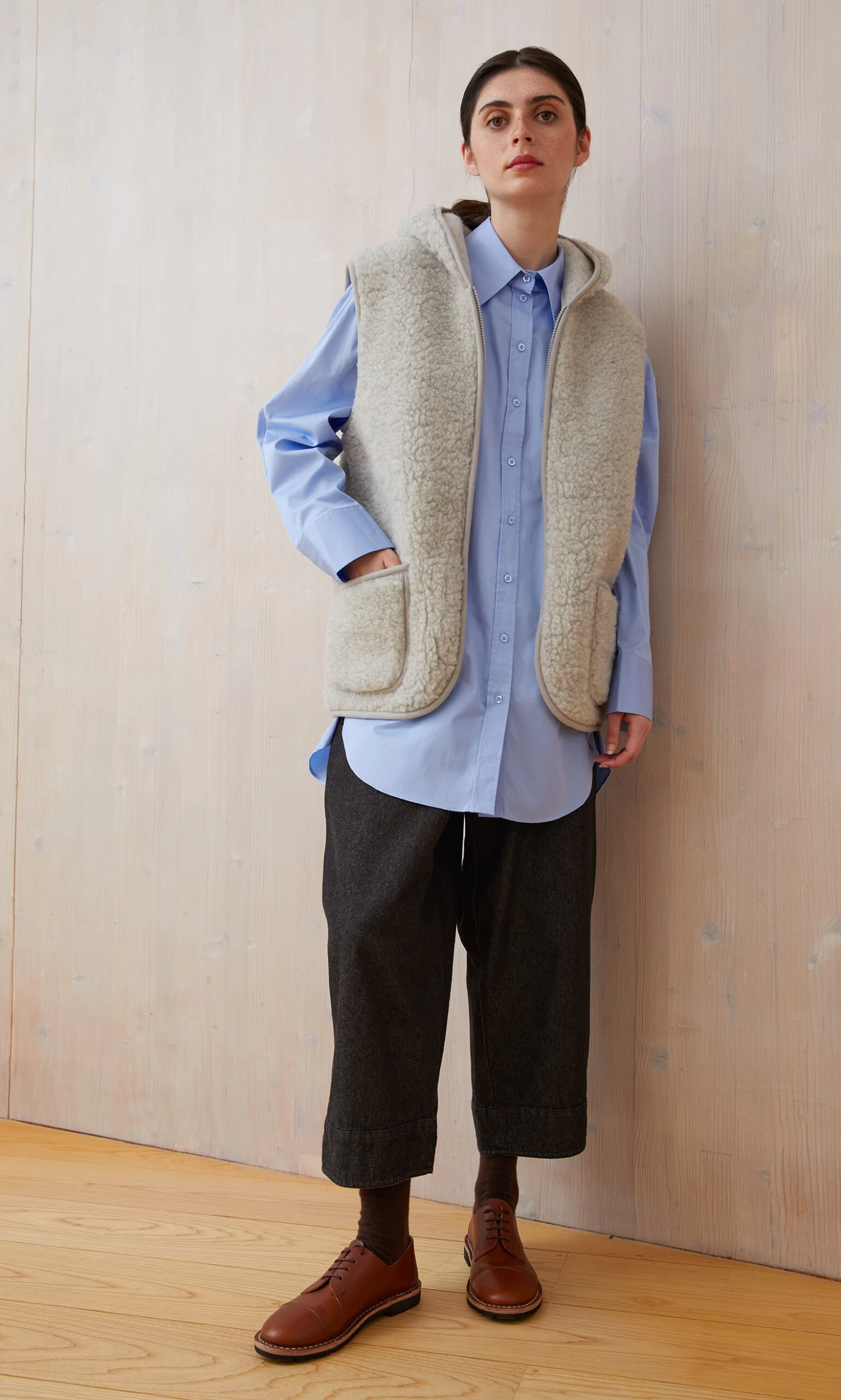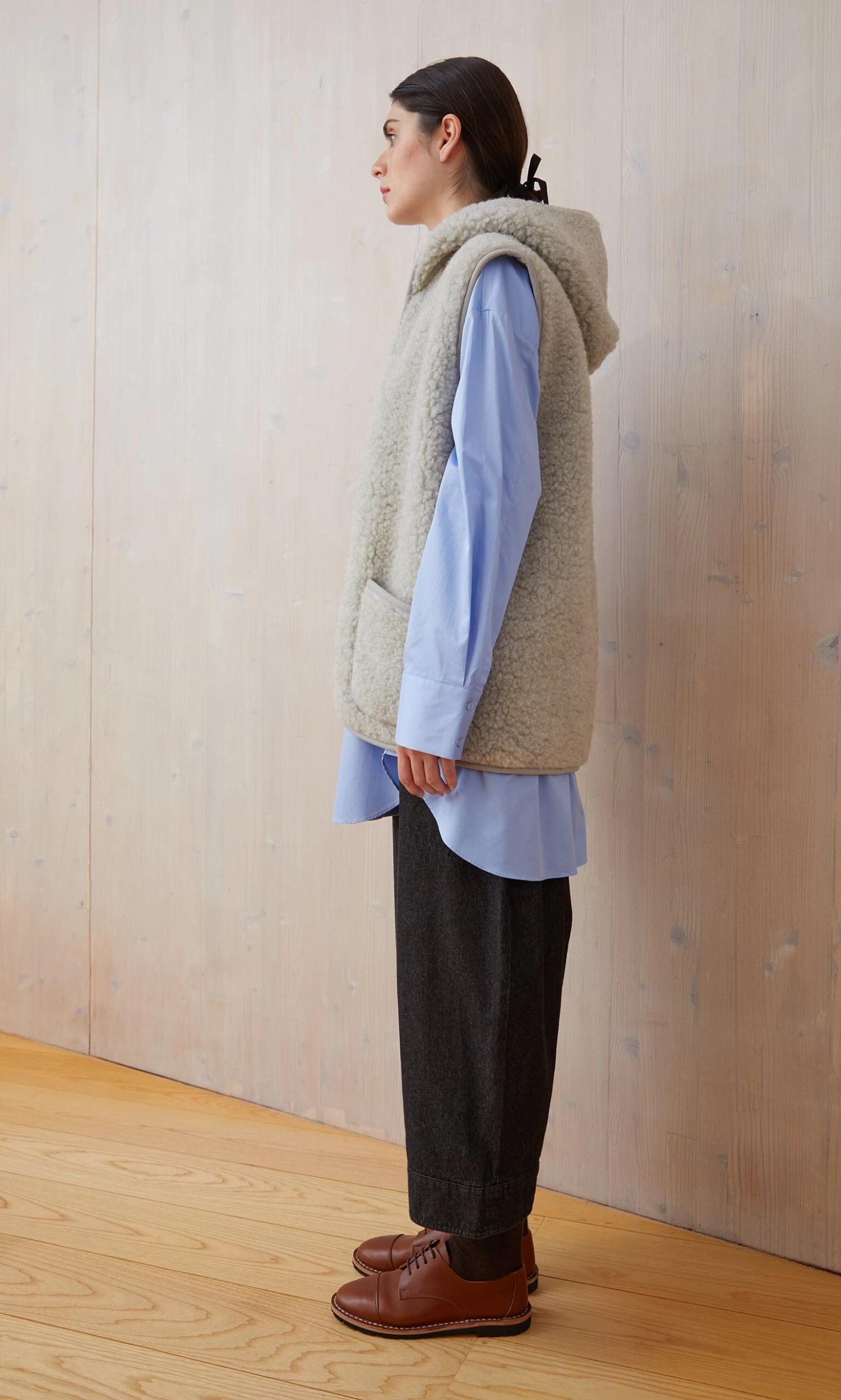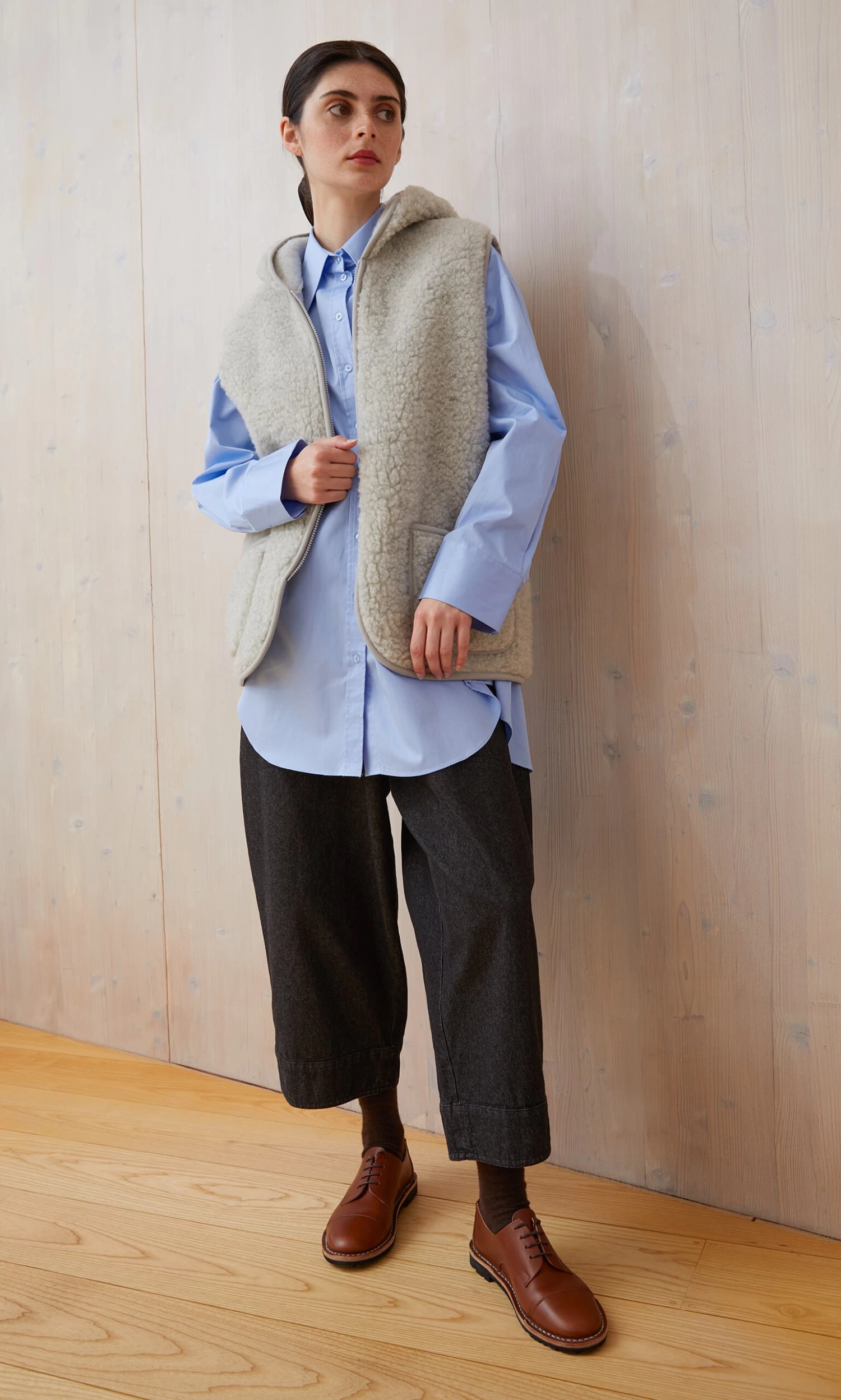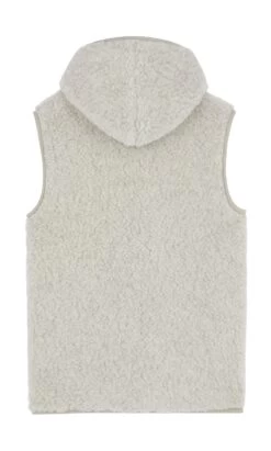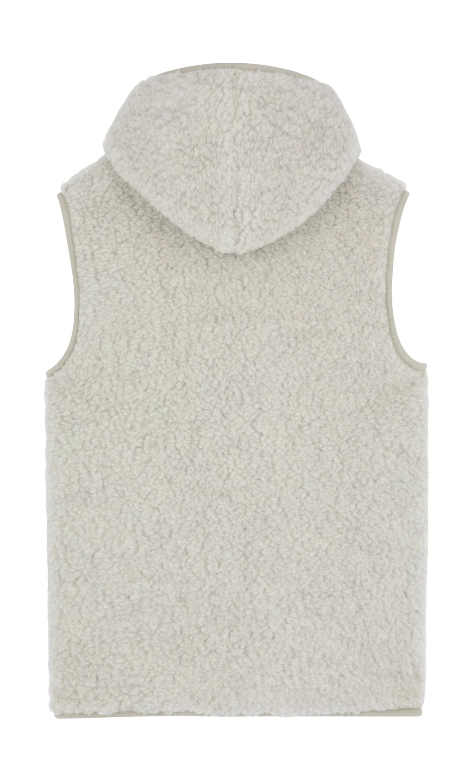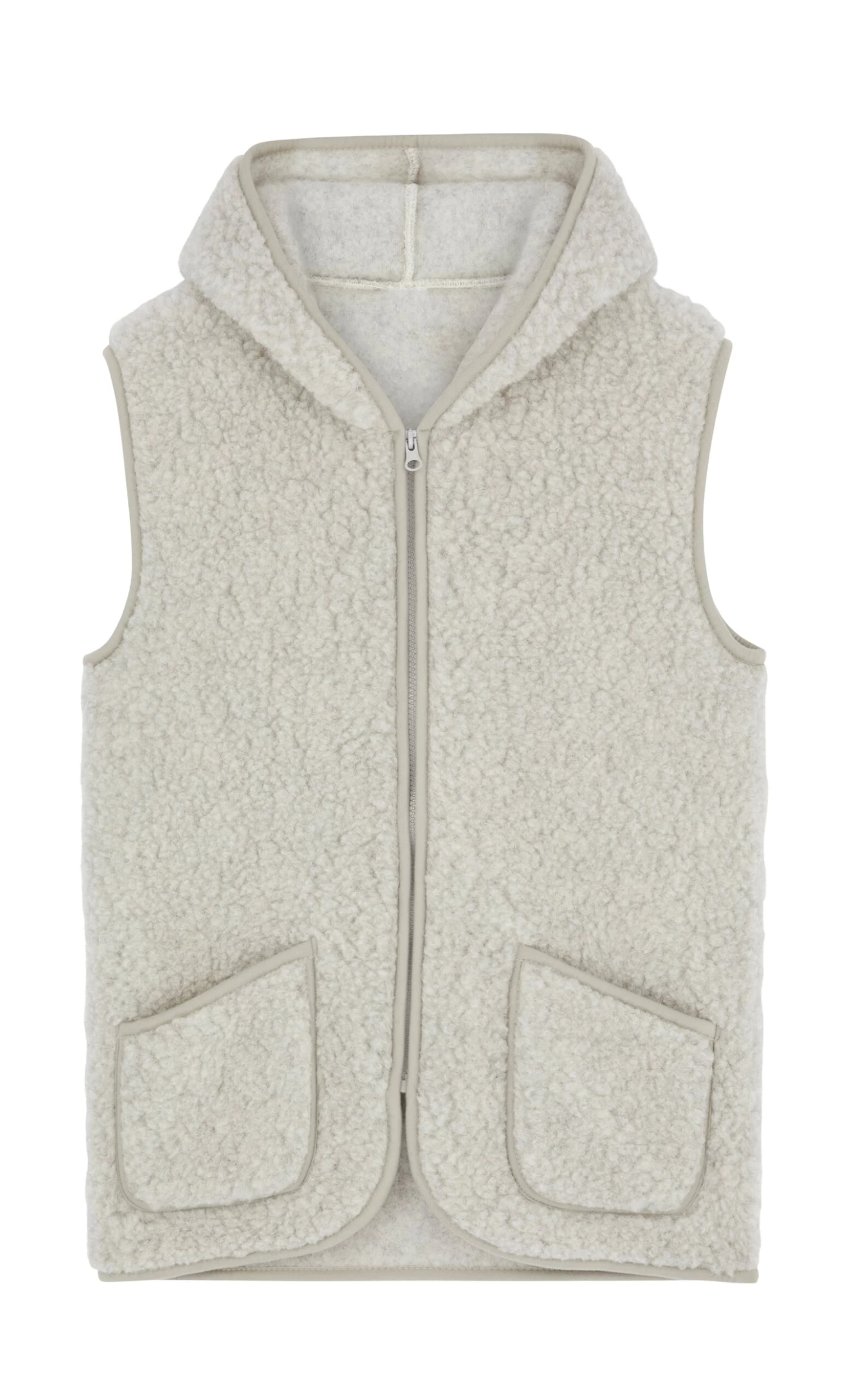 Super snug and lightweight grey gilet made from tactile Irish wool fleece with integrated hood. Easy additional layer to keep the chills at bay. Zip front. Cosy patch pockets.