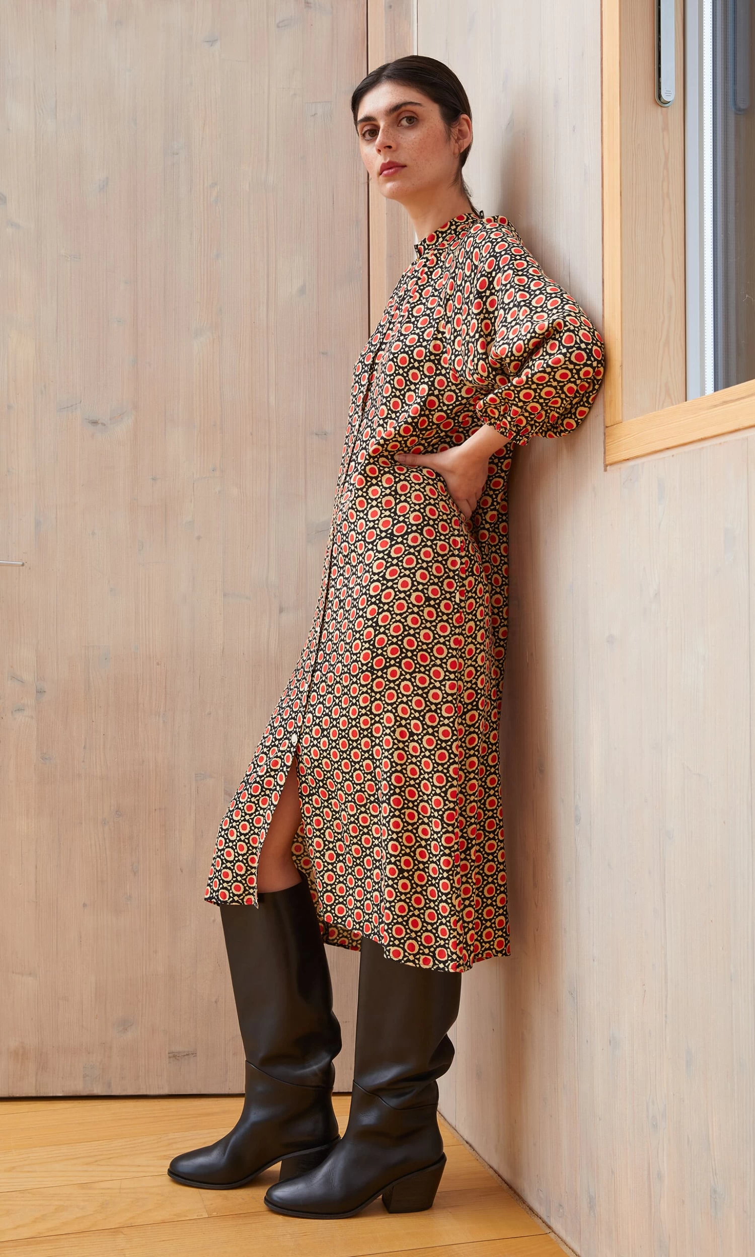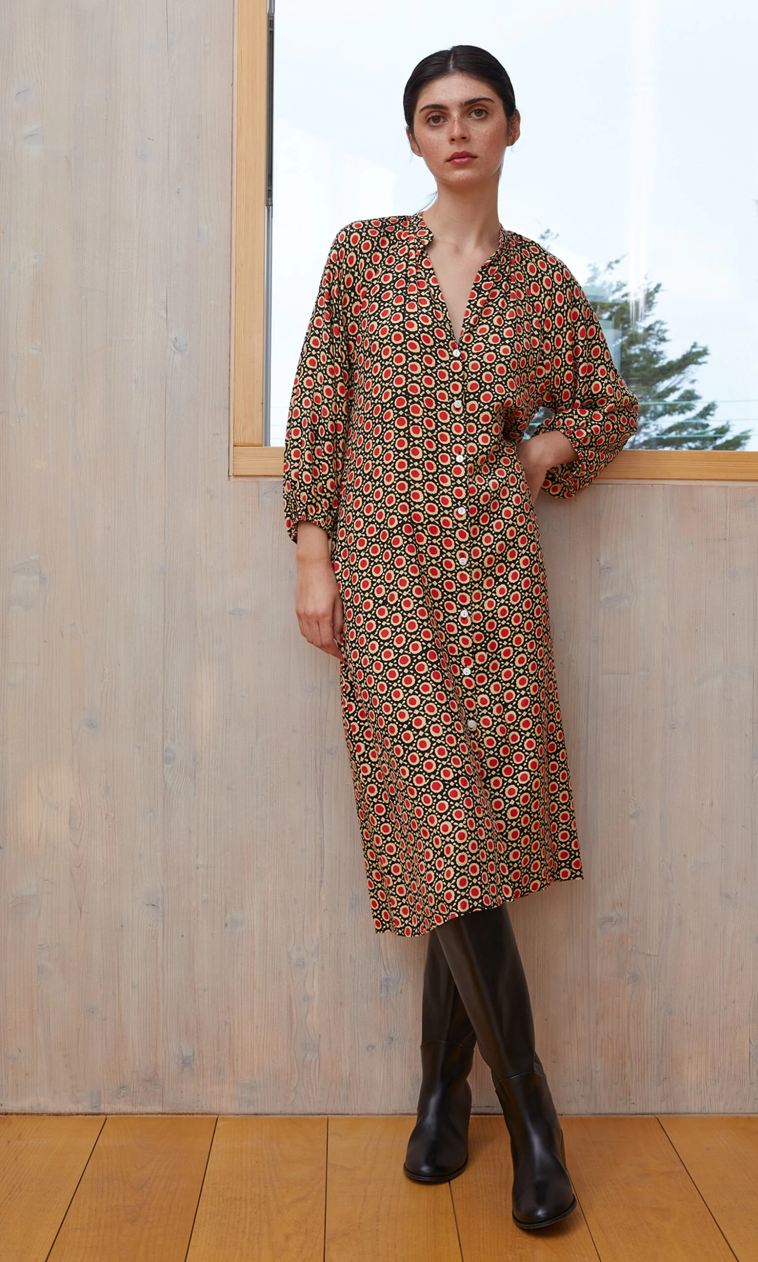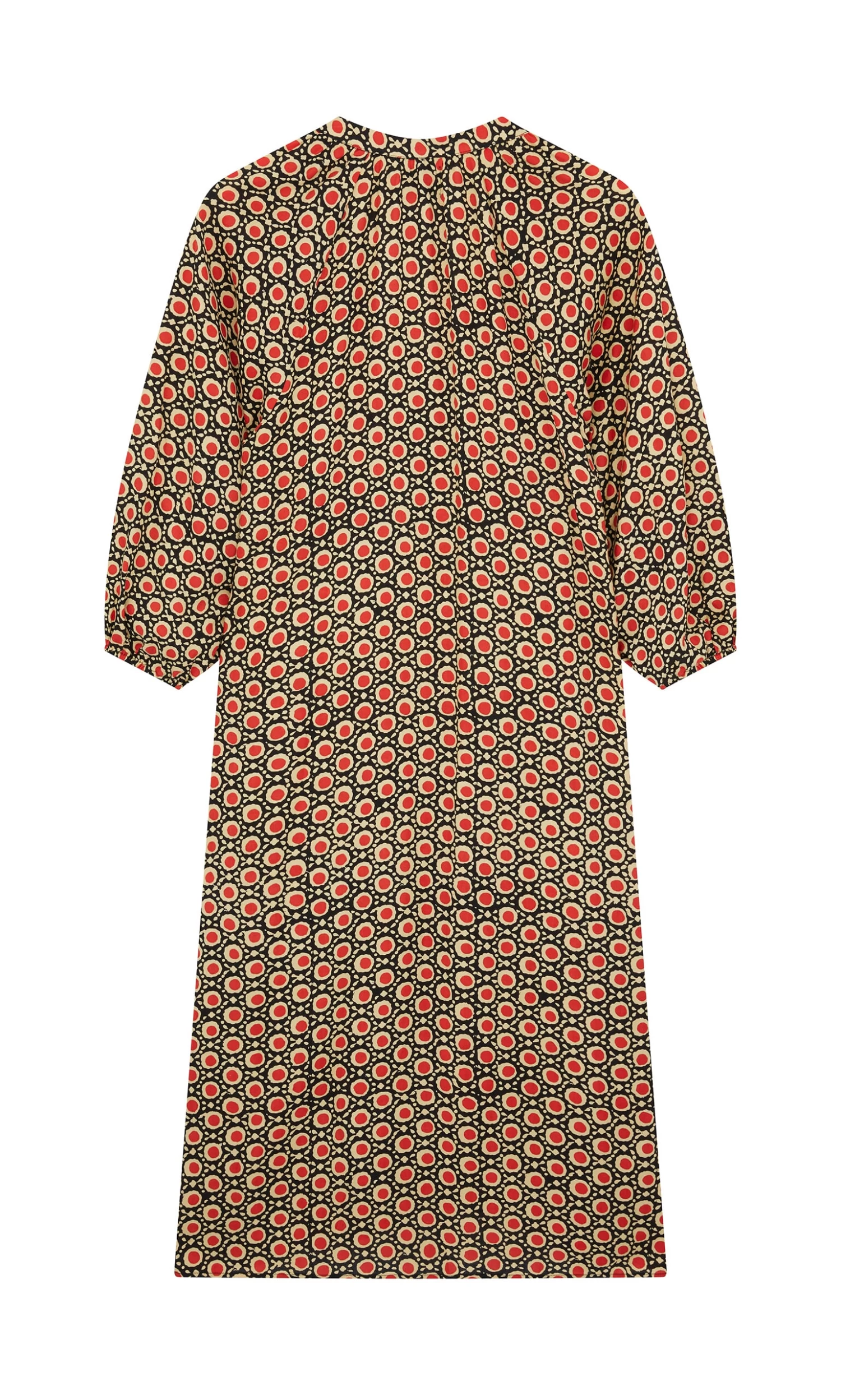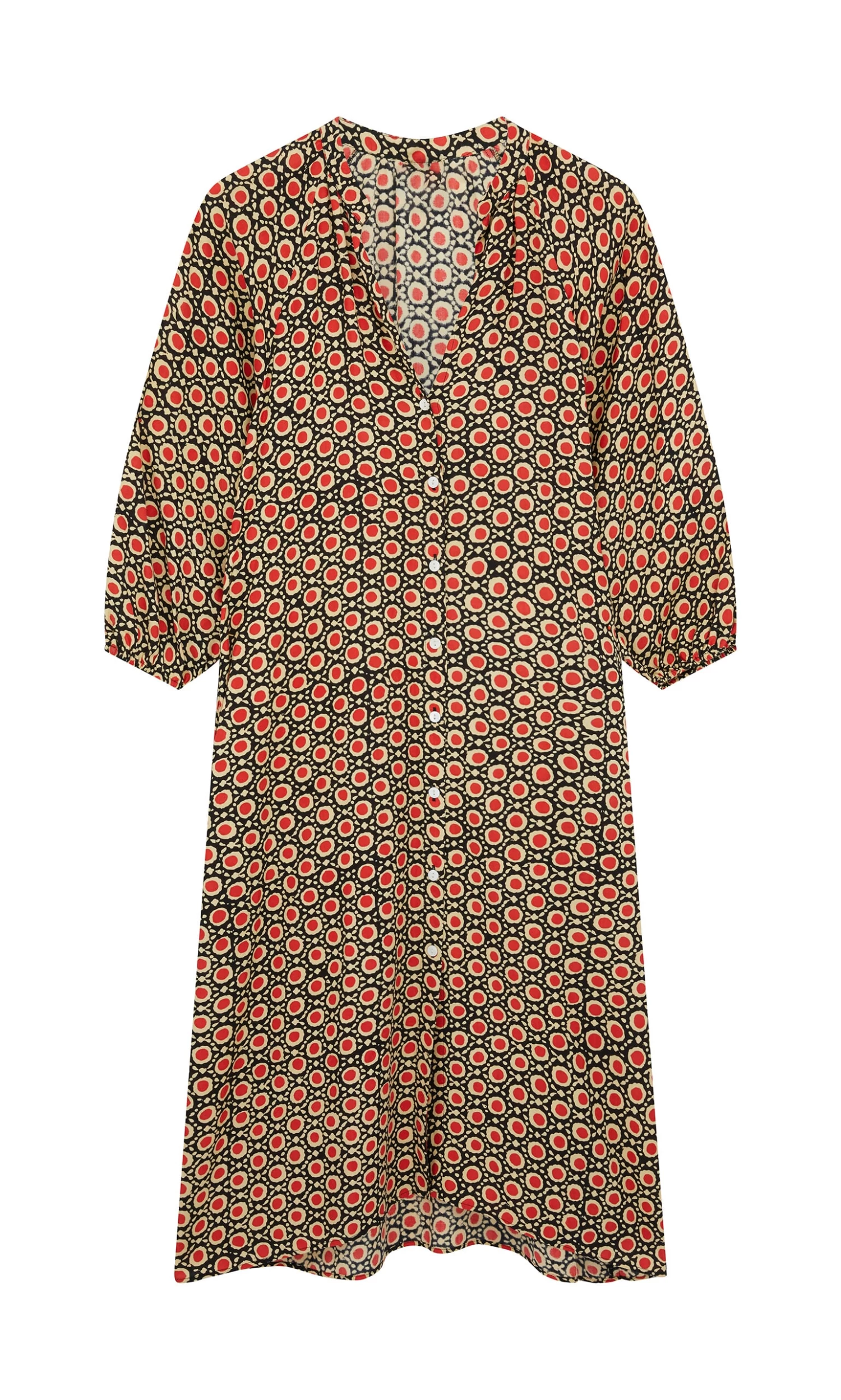 Dotty screen print dress cut to gently skim the body. V neck opening with mother-of-pearl buttons fastening up the front. Puffed sleeves are gently gathered into elasticated cuffs. Side seam pockets. L110cm.