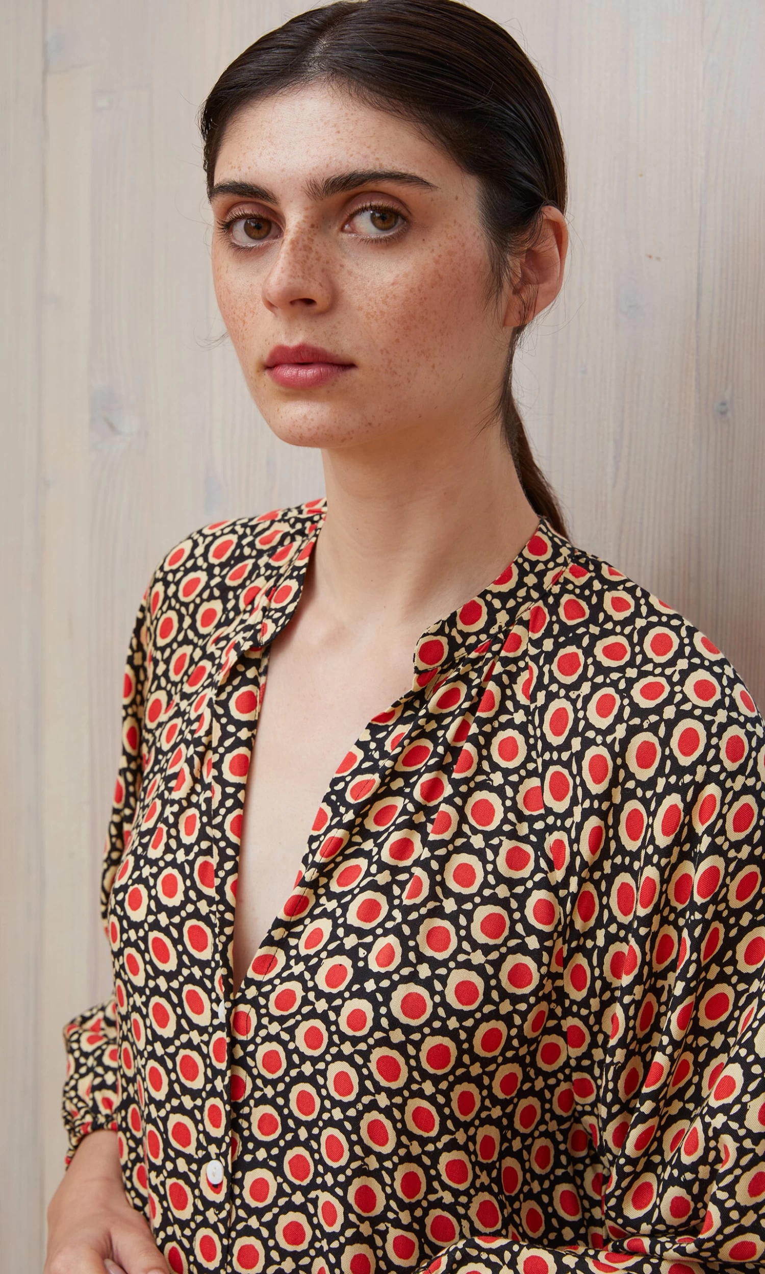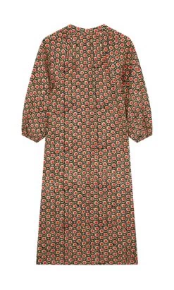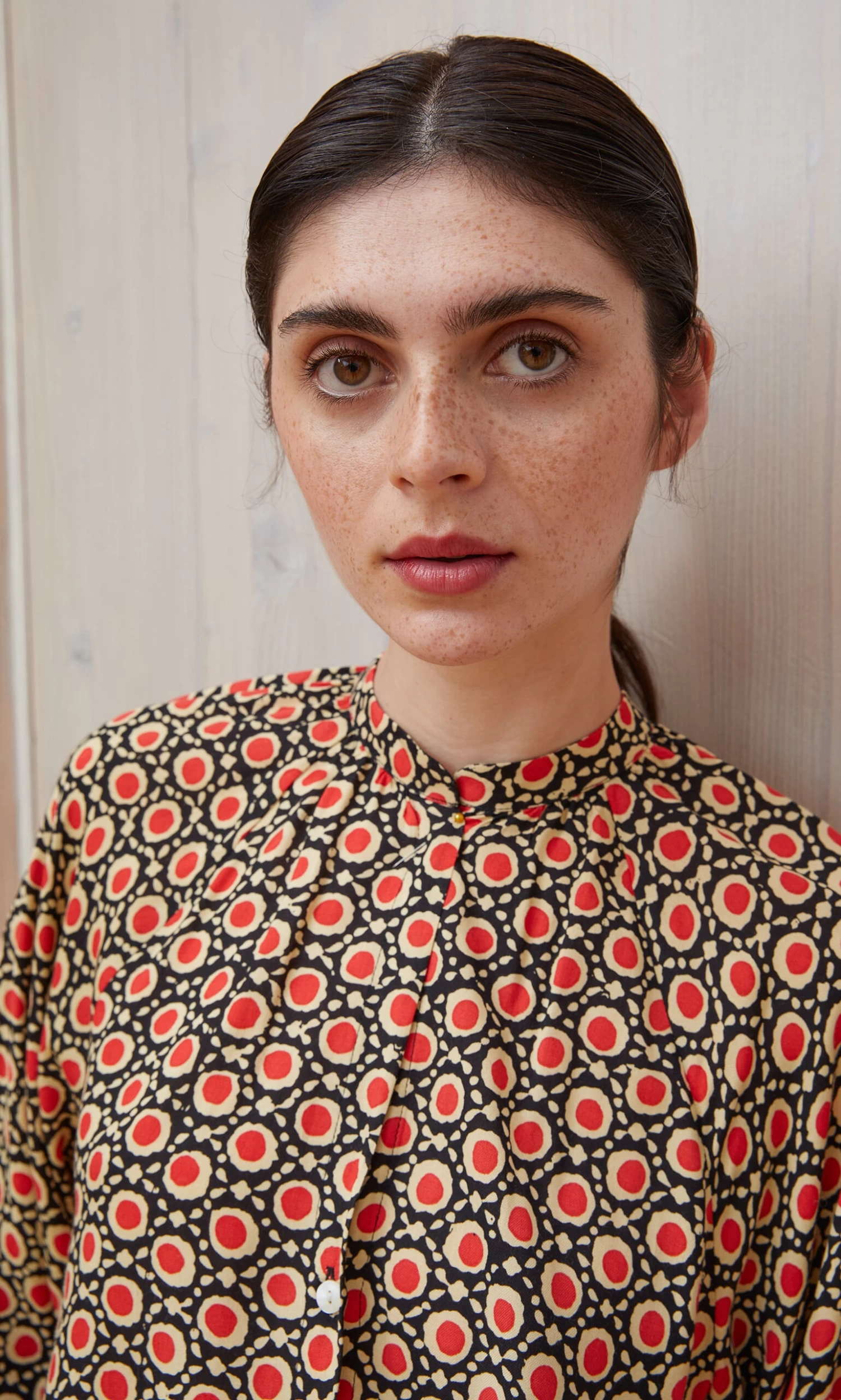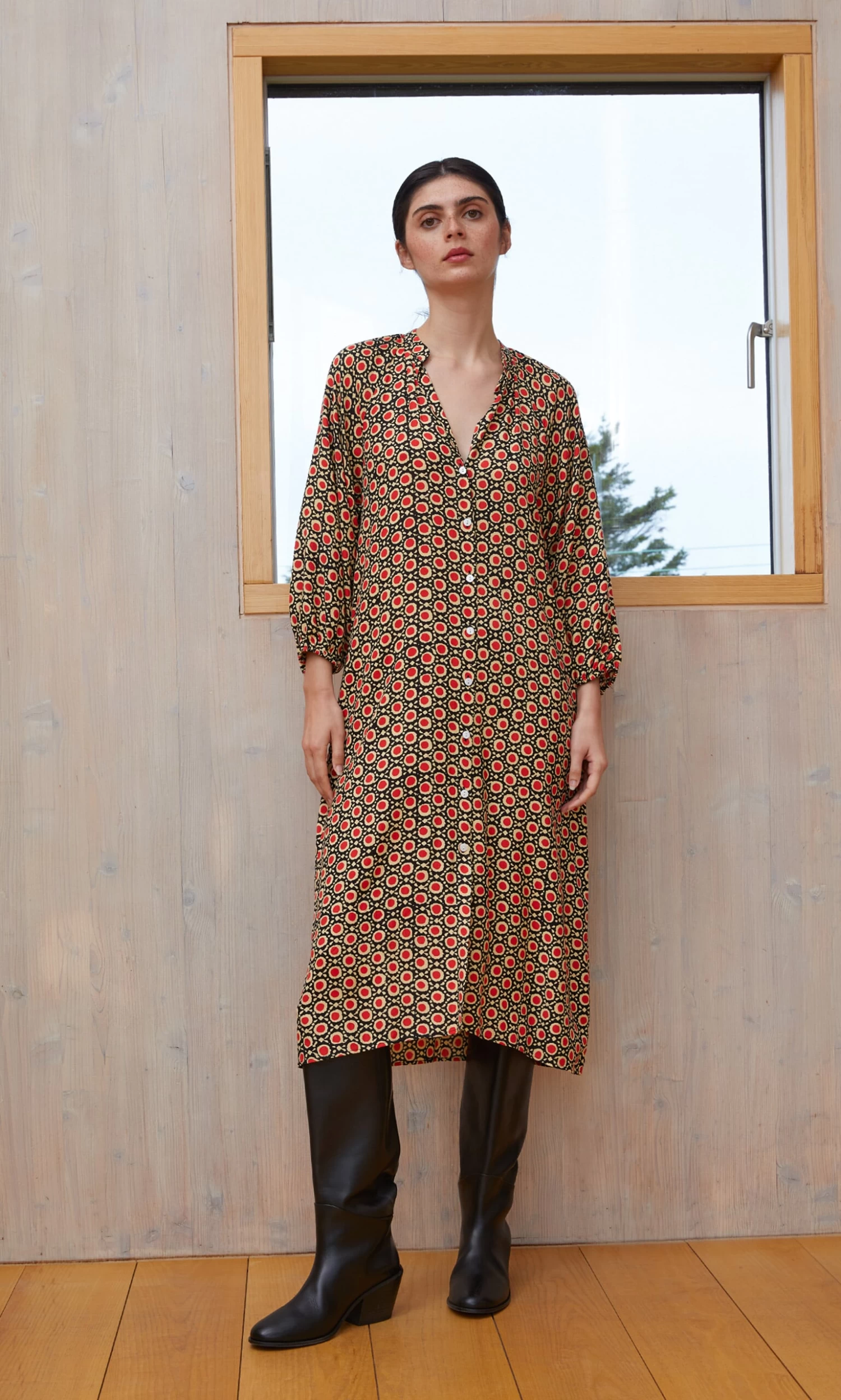 Dotty screen print dress cut to gently skim the body. V neck opening with mother-of-pearl buttons fastening up the front. Puffed sleeves are gently gathered into elasticated cuffs. Side seam pockets. L110cm.